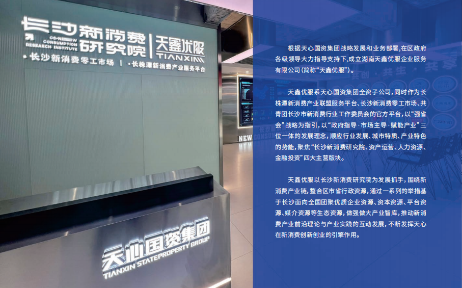 2022年10月31日,由湖南省商務(wù)廳指導(dǎo)、長沙市商務(wù)局和天心區(qū)人民政府共同發(fā)起,正式授牌長沙新消費研究院,由天心國資集團(tuán)全資企業(yè)湖南長沙新消費產(chǎn)業(yè)研究有限公司運營。