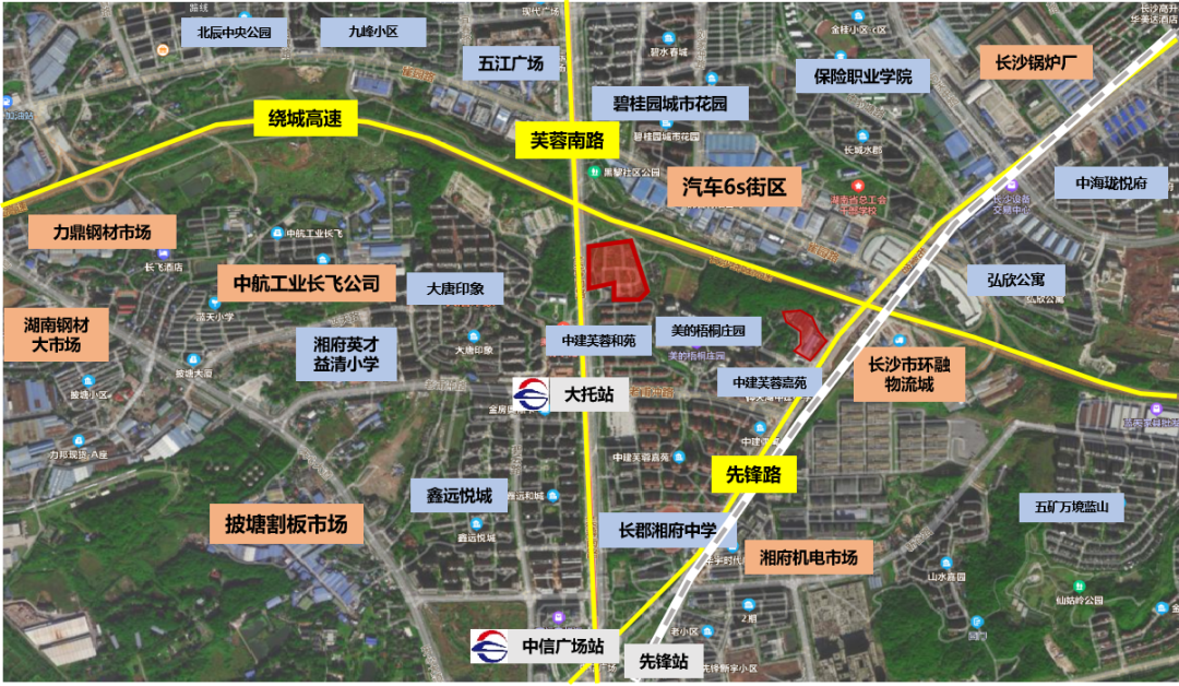區(qū)位緊鄰長沙繞城高速,為南部片區(qū)起步區(qū):塊位于天心先鋒街道,屬于南部片區(qū)起步區(qū),為長株潭融城樞紐單位,具備區(qū)域整體聯(lián)動和資源整合的先天優(yōu)勢。交通便捷,芙蓉路地塊緊鄰地鐵1號線大托站,先鋒路地塊靠近城鐵先鋒路站:①地鐵站:靠近1號線大托站和1號線環(huán)保大道站;②高鐵站:距離長沙南、湘潭北30分鐘左右車程,距離株洲西站50分鐘左右車程;③城鐵站:先鋒站僅4分鐘即達,附近還有昭山站和九郎山站;④長途汽車站:距離長沙汽車南站約12分鐘車程;⑤飛機場:離長沙黃花機場約35分鐘車程。處于長株潭商圈,商業(yè)氛圍濃厚:周邊分布有友阿奧特萊斯、中海寰宇城、五江廣場、汽車6s街區(qū)等綜合商業(yè)體。教育資源豐富:地塊緊靠仰天湖中建小學,周邊配套湘府英才益清小學、長沙市長郡湘府中學、保險職業(yè)學院等學校,教育資源豐富。