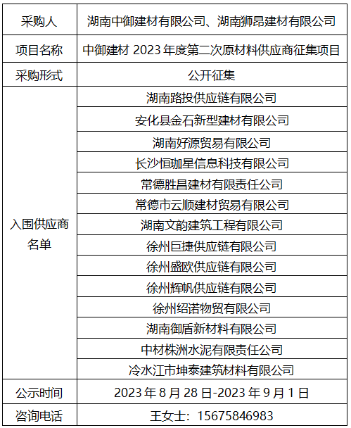 特別說(shuō)明:請(qǐng)以上入圍供應(yīng)商單位在公示之日起到2023年9月3日17時(shí)止至湖南中御建材有限公司進(jìn)行二次商談,若未在規(guī)定時(shí)間內(nèi)進(jìn)行商談的則視為自動(dòng)放棄入圍,將取消入圍資格。